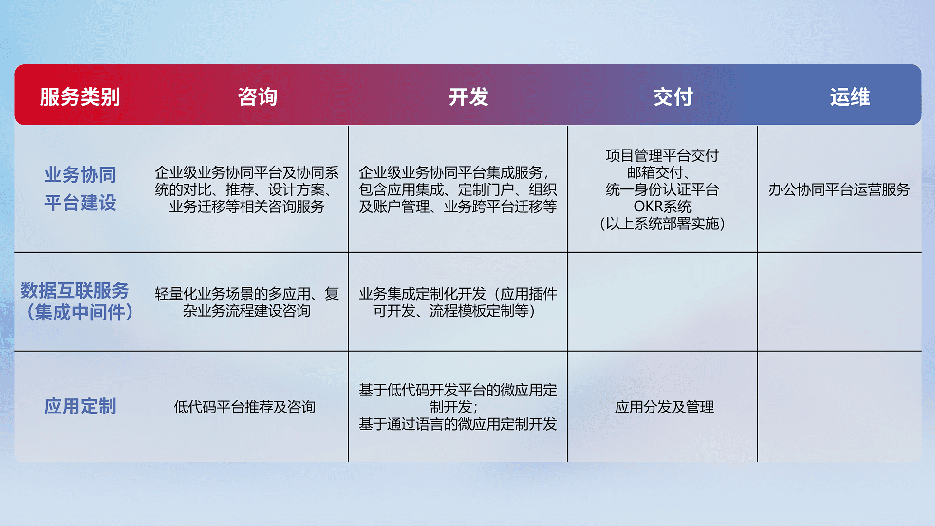 针对钉钉、、企微、、、IDaas等平台级产品提供产品的规划、、方案、、、、交付、、定制化开发等服务,,,,实现如统一协同办公、、、智能客户服务、、、混合会议管理、、智能数据查询、、、、等业务场景,,,实现数字化转型。。