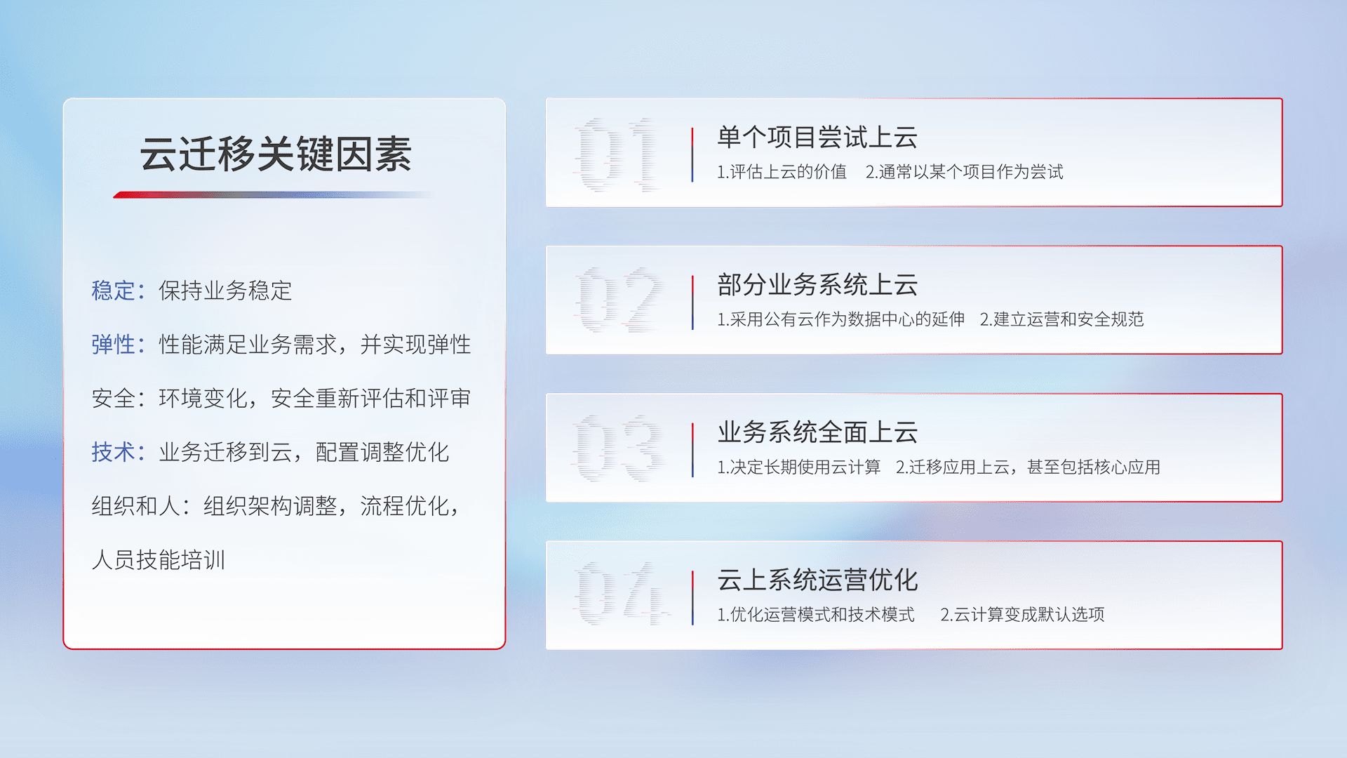 结合实际业务,,,从规划设计、、云平台选型、、云原生改造、、、、数据迁移、、集成交付,,迁移全过程为客户识别最佳上云路径,,,做好风险识别管理,,设计网络架构、、身份权限、、、、安全审计合规、、操作审计、、、、日志审计、、监控告警策略、、多站点容灾设计等,,,,对云上基础设施进行整体规划,,,,提升IT治理水平,,,以满足弹性、、、、高可用、、、、高性能的需求。。。