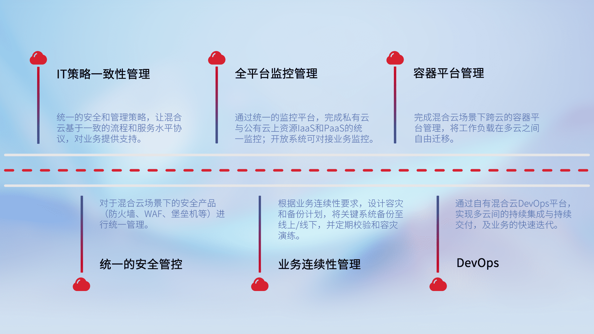 通过多云纳管,,以统一的资源数据模型把客户的云资源进行抽象和封装,,进而实现对多云资源的统一操作,,,保障云资源管理的可靠性、、稳定性与可用性。。量身定制化运维内容,,配置、、、、开发运维、、、、补丁管理、、、备份、、、监控、、、认证和访问管理、、、、审计和日常巡检等,,,保障在用云过程中的可靠度,,,稳定度以及高可用率。。